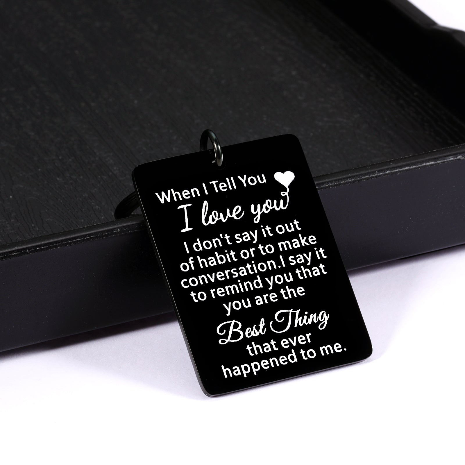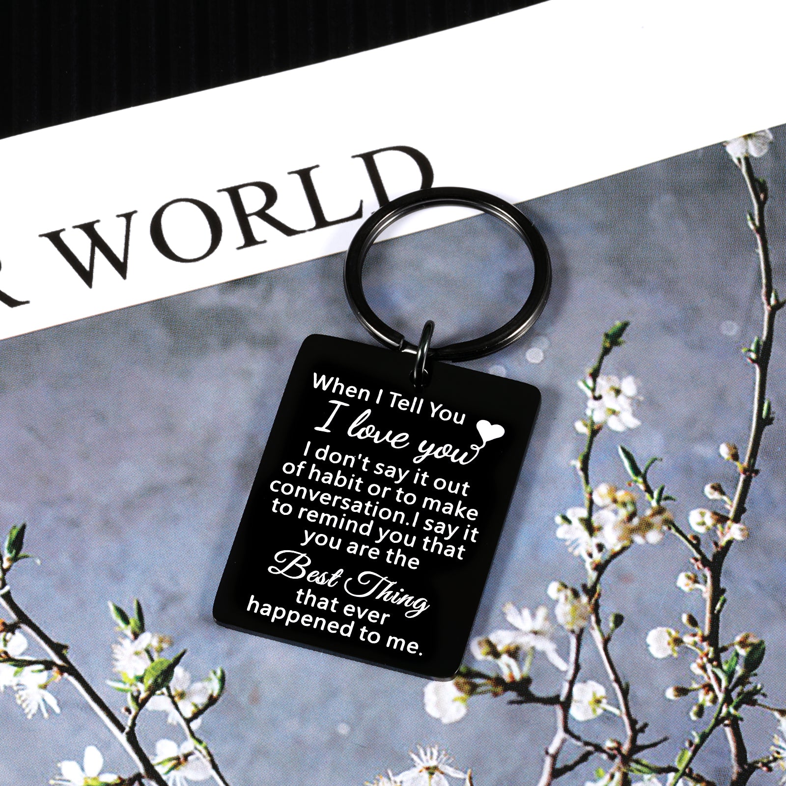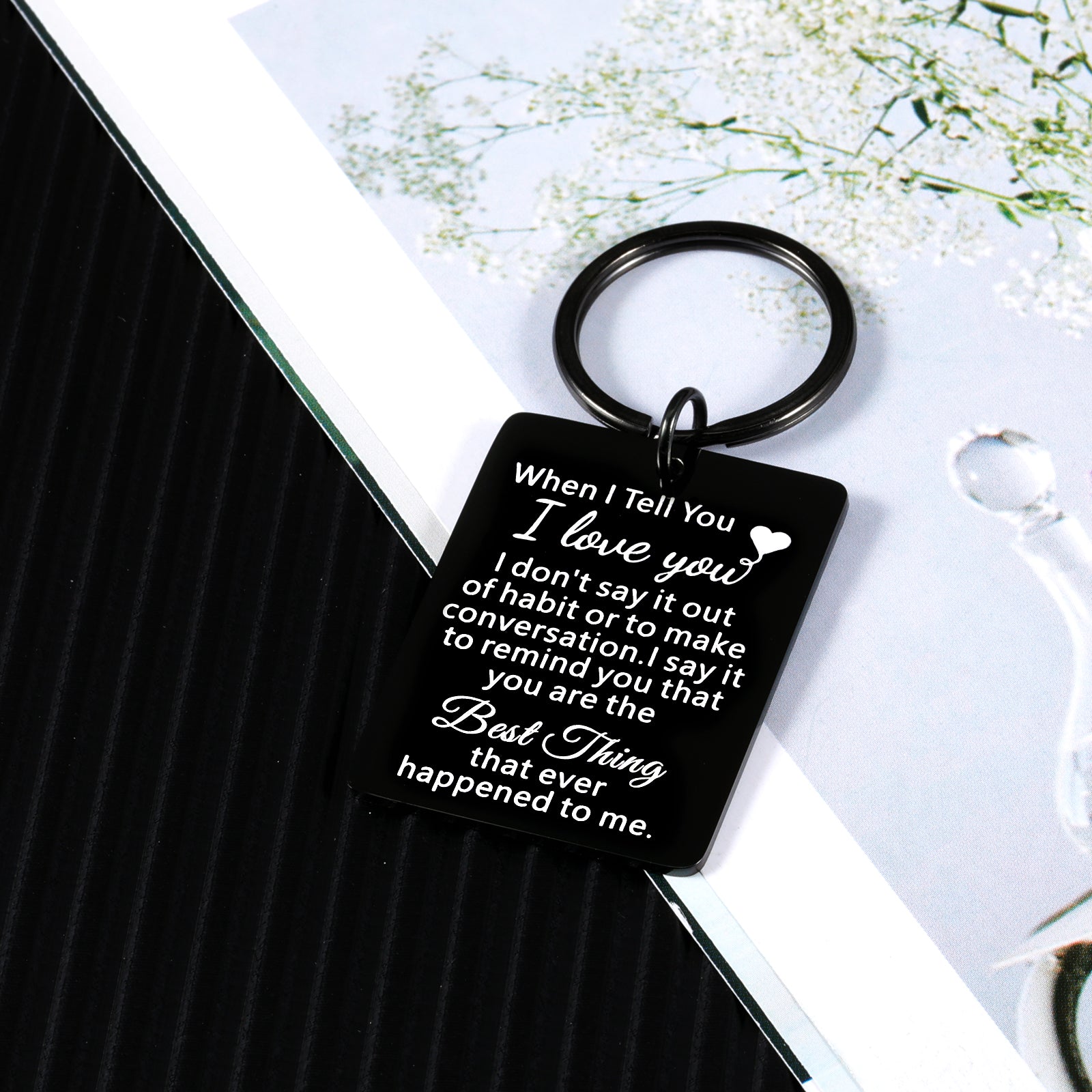 - 【I Love You Gifts for Him Her】Make a cut love you gifts for men women. The small jewelry with engrave sweet quotes is a wonderful gifts idea for him her. “When I Tell You I Love You. I don't say it out of habit or to make conversation. I say it to remind you that you are the best thing that ever happened to me.” This love you more keychain remind them that you are saying “I love you and you are the best thing that ever happened to me”.