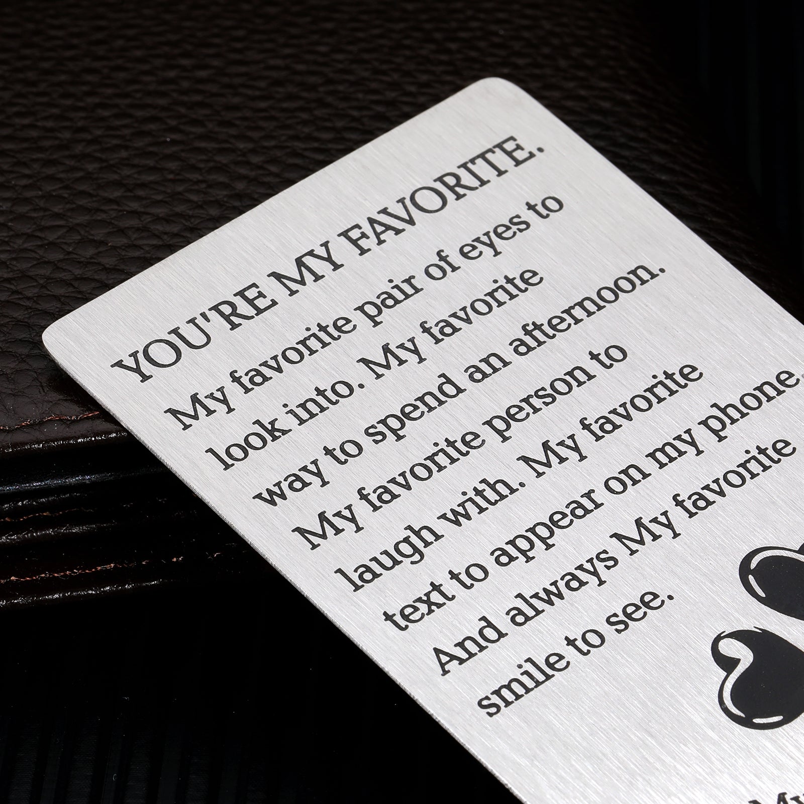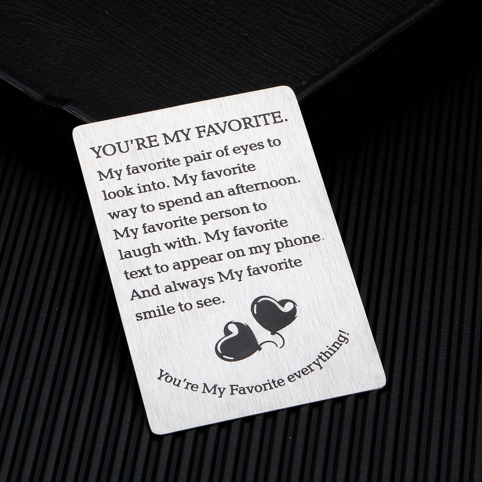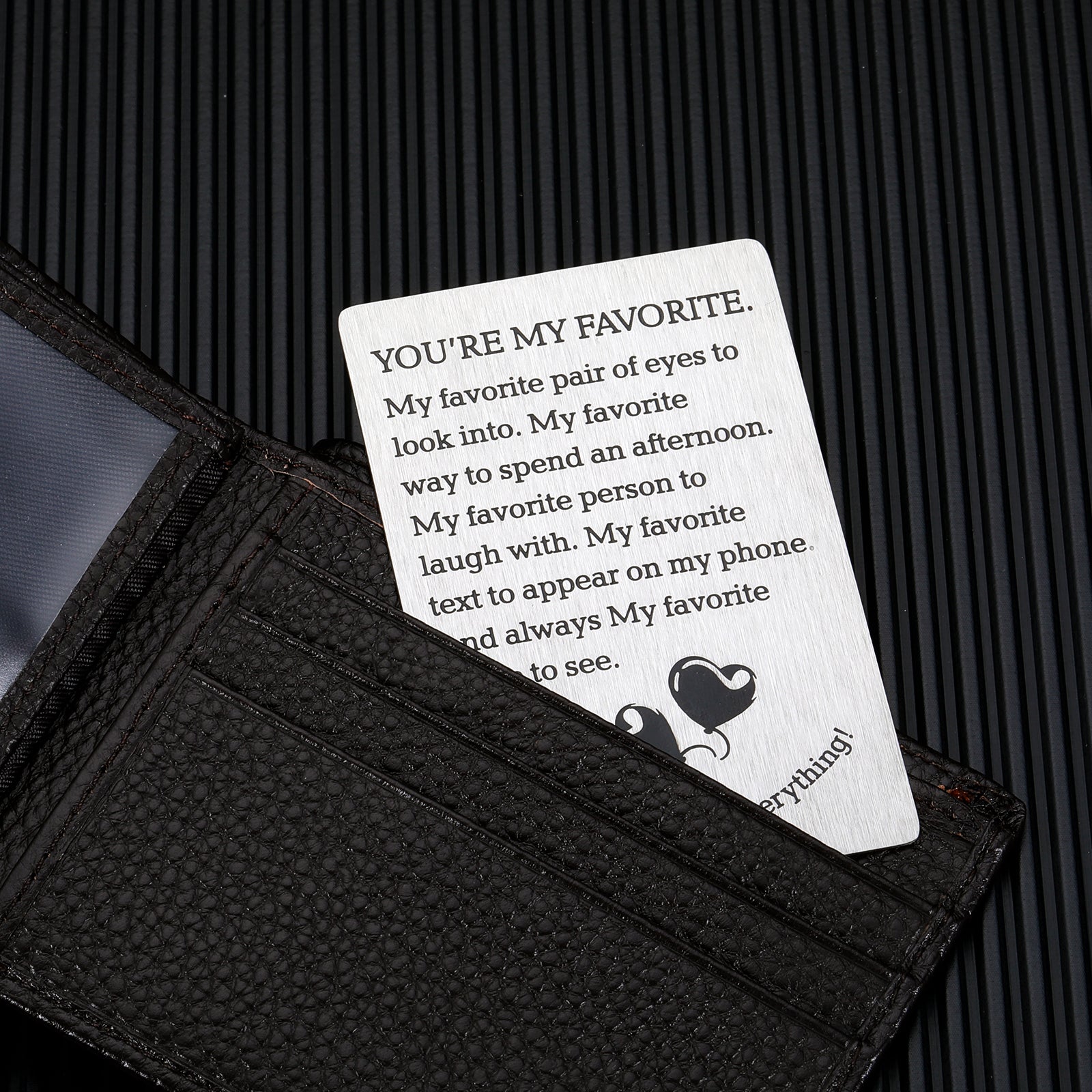 - 【Stocking Stuffers for Men】This love wallet insert card engraved with romantic words makes great stocking stuffers for men on Christmas. Great romantic gifts for him her, couple gifts for men women, valentines day gifts for him, men, boyfriend Christmas gifts, husband Christmas gifts from wife. Christmas cards for husband, birthday card for boyfriend. Make the unique gifts to your husband, wife, boyfriend, girlfriend, fiance, fiancee, bride, groom to let him/her know that: “You are my favorite”!