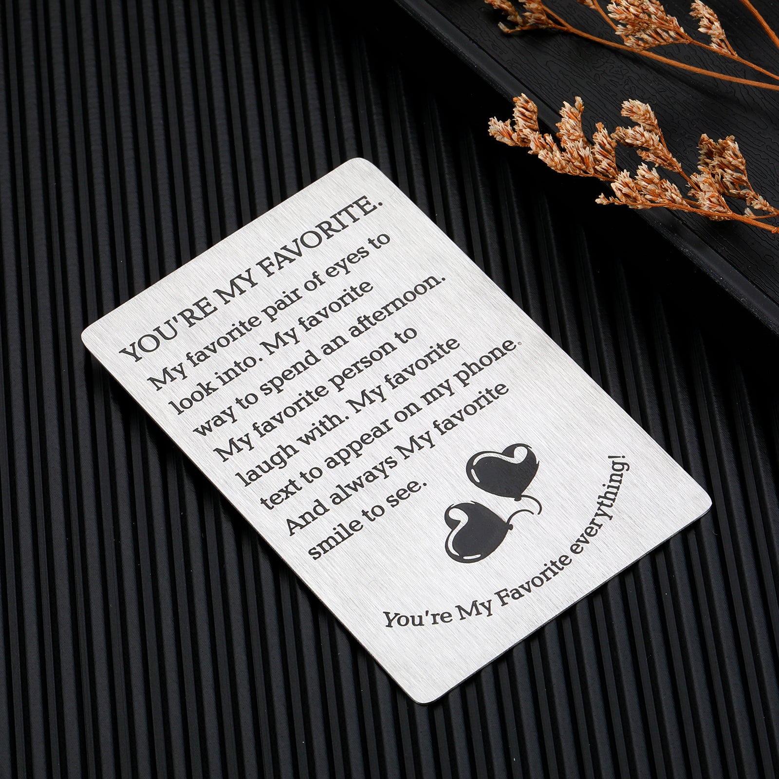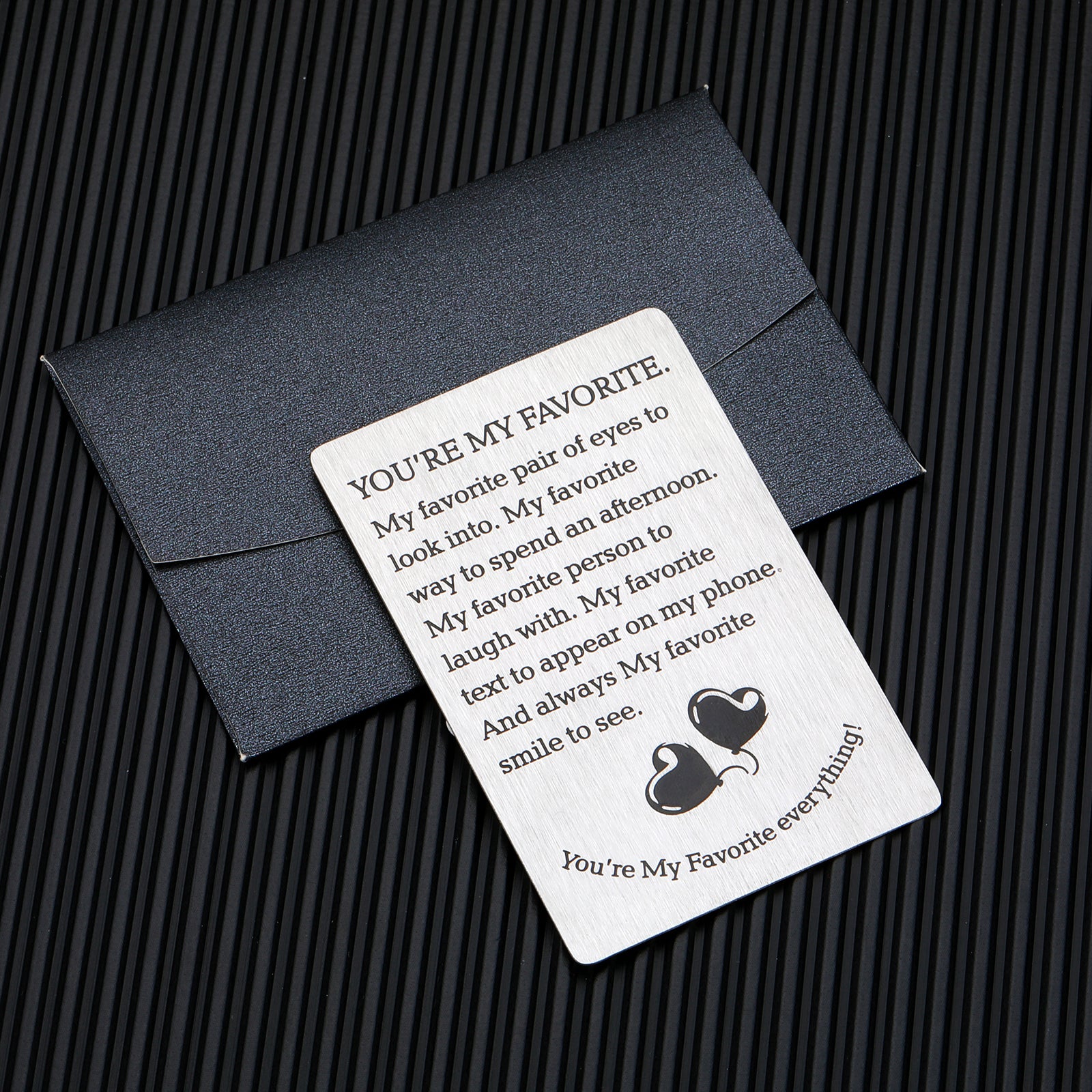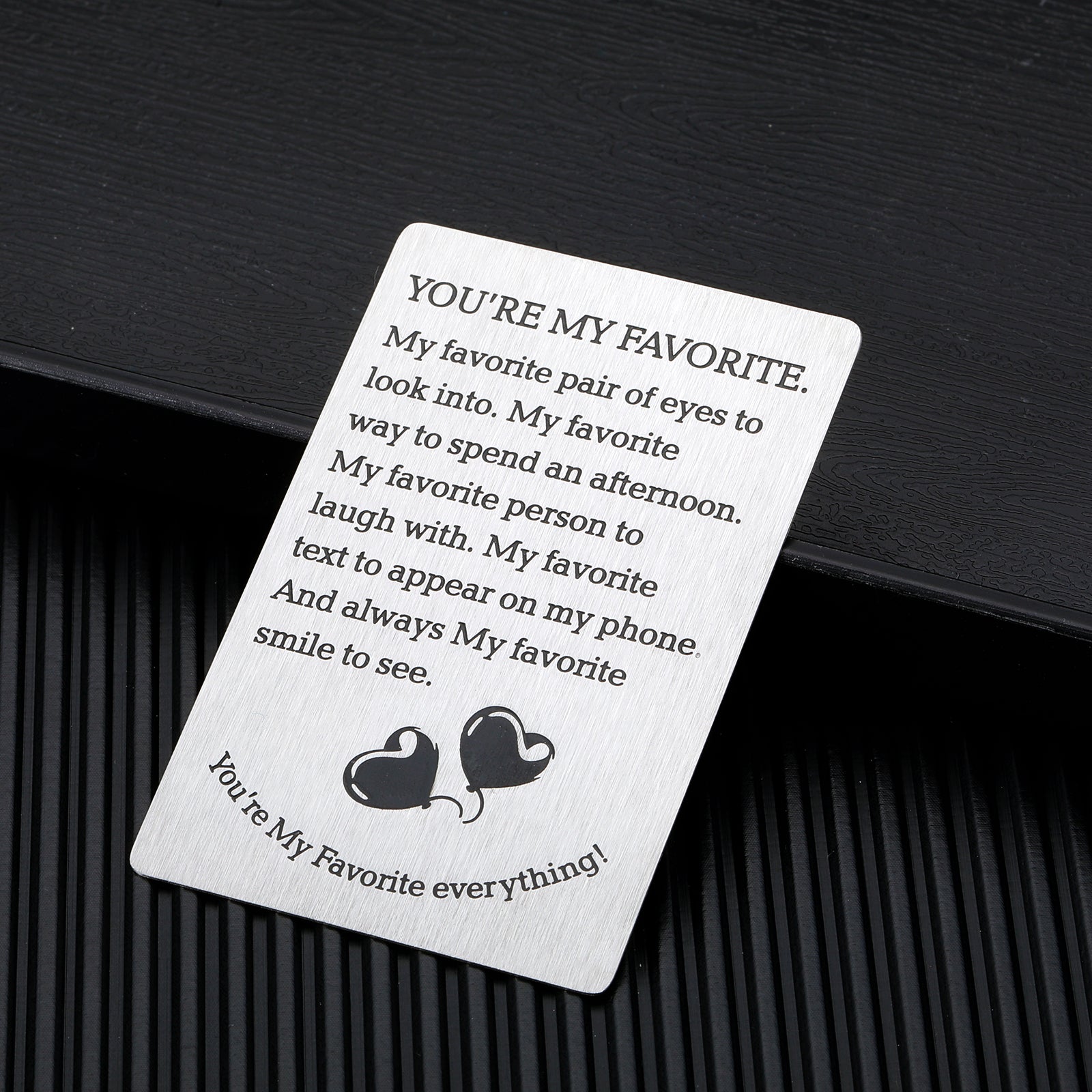 - 【Stocking Stuffers for Men】This love wallet insert card engraved with romantic words makes great stocking stuffers for men on Christmas. Great romantic gifts for him her, couple gifts for men women, valentines day gifts for him, men, boyfriend Christmas gifts, husband Christmas gifts from wife. Christmas cards for husband, birthday card for boyfriend. Make the unique gifts to your husband, wife, boyfriend, girlfriend, fiance, fiancee, bride, groom to let him/her know that: “You are my favorite”!